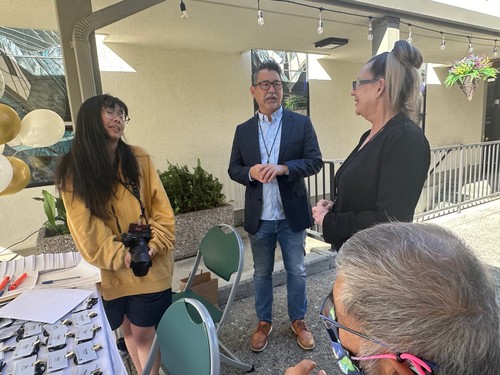 Hikaru Bakoshi and Rev. John Oda with Leighton Horio in the foreground, welcome one of the first to arrive.