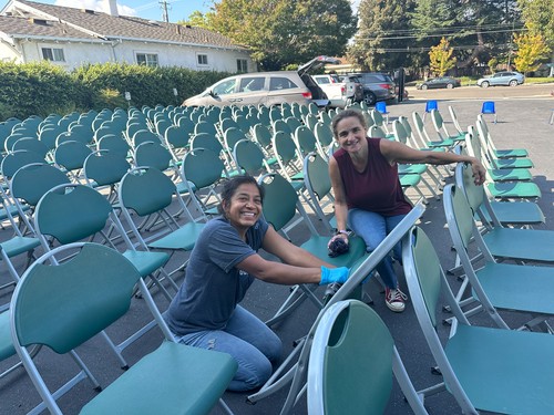 Oh my... a sea of chairs cleaned by a Grant School staff person, Lilian Flores, and the school's former principal, Paulette Zades.