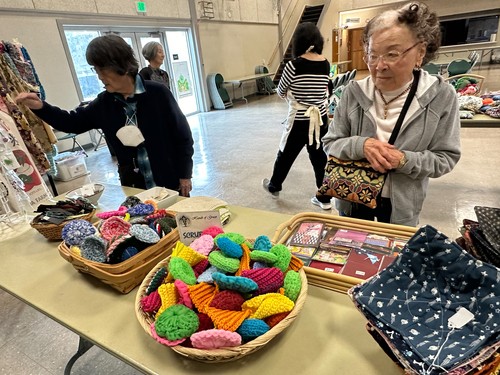 Mostly Wesley folks checked out the craft items for sale with Flo Oishi and Janice Noda shopping.