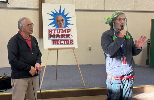 Taking part in putting this event together were from left: Rev. John, Kelvin Kamachi, Kelli Martines who organized all the details that are unseen, Tina Urata, WUB leader, Mary Sasaki, the table set- up, decorations, and kitchen crew, and Carl Morimoto who provided the art and photo work for the Stump Hector sign.