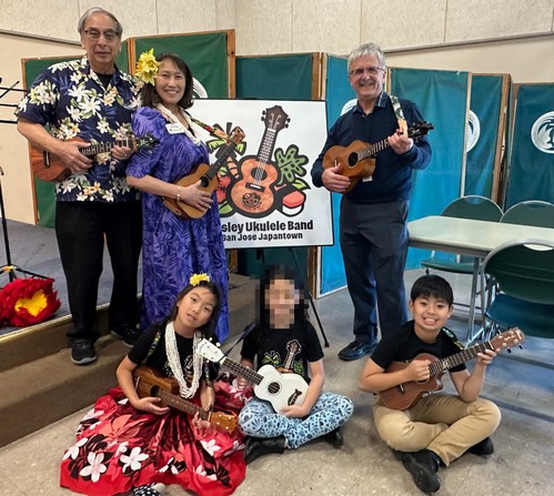 The Band’s Keiki, children’s class, performed "Wipe Out" and "The Lion Sleeps Tonight". Shown here with Natalie, Arissa, and Yuzuru with from left: Uncle Smiley, Ms. Tina and Mr. Mark.
