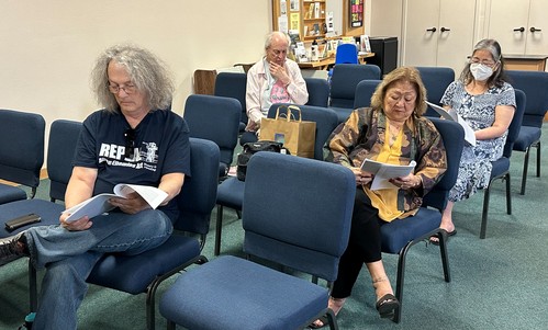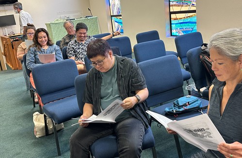 Actors and a playwright Steve Nakano, Tasi Alabastro, Dana Soliman, and Samantha Ricci, from our J-town community along with members of Wesley, Carol Mar and Brenda Gee above, read Mark Teagle’s new musical/play "Casting Stones" on March 29.