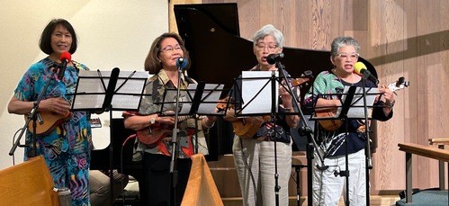 All the weeks in August while the choir is on hiatus, Mark Teagle has graciously opened up the flood gates to allow for special music to fill the gap in the worship service. Performing on Aug. 13 were four members of the Wesley Ukulele Band, from left: Tina Urata, Jane Wong, Becky Soffioto, and Barbara Hiura performing the Point of Grace version of “You Are My All in All."