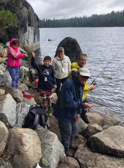 Mark Teagle led a group of hardy souls around the 4-plus mile lake and they were done in record time. Better that it was cool, had plenty of water and no crowds. Nice to be in God’s country offering time for reflection. Everyone found it! Peace, joy, laughter, and love that was graciously shared with one another. Camps A and B the kids and family camp area had movies nightly and enjoyed soy sauce hot dogs and rice along with popcorn and snacks galore. Camp C, E and F had campfires all but one night and the adults sat and talked around the fire for hours all while eating nachos, spam musubi, smoked steelhead trout ala Steve Tabuchi, and chili rice complements of Mary Sasaki. Camp D, the teens and youth??? They did their own thing and parents noted they didn’t see them but for meals. It didn’t matter that there was no horseback riding or swimming.