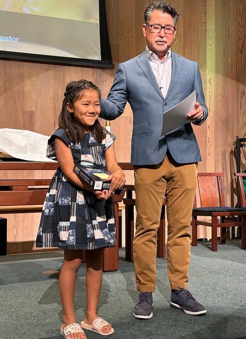 A child’s first Bible is given to all third graders and Akemi received hers from Rev. John Oda.