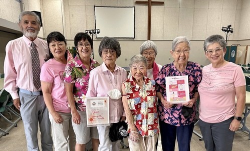 A numbers of United Women of Faith members and other church members dressed in pink to promote “Breast Cancer Awareness Month” on Oct. 8. From left: Leighton Horio, Mary Horio, Terri Koike, Flo Oishi, Joanne Kumano, Alice Hikido, Kazuko Tengan, and Barbara Hiura.