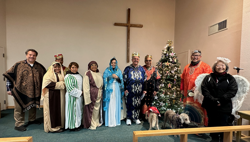 The evening began with a gathering of parishioners from La Primera Iglesia and our church. There were only five from our church, Rev. John Oda (Sir Hennessy and Brin), Mark Teagle, Bev and Hector Acuna, and Barbara Hiura) and the group from La Primera Iglesia were costumed as Joseph, Mary, the three magi, shepherds, and God’s Holy Angel. With Mark Teagle wheeling a music box, we sang English and Hispanic Christmas carols as we trekked from our church to theirs. Upon arrival, Mary and Joseph were denied entrance as they acted out what transpired in Bethlehem those many years ago. Upon entry, the troupe was greeted by 30 or so members of La Primera Iglesia and the story continued in their beautiful sanctuary. We sang songs in Spanish and English, and the liturgy done bilingually presented the Nativity story of Jesus’ birth. Rev. John Oda gave a brief message about the meaning of this Jesus experience and what this is for us right now and in everyday life noting that there are Godwinks surrounding us and everywhere, and when we pay attention, we are uplifted and Jesus fills us up.