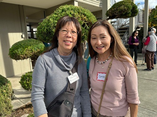 Shelley Nakashima (co-Chair) on the left rested for just a moment as she was seen scurrying around ensuring that the mochi was moved from the Fellowship Hall to the sale room.