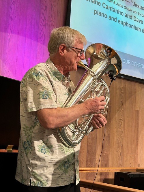 Dave Brown above and Shane Cantanho (below left) thrilled the congregation with “Jesus Part it All,” duet for euphonium and piano.