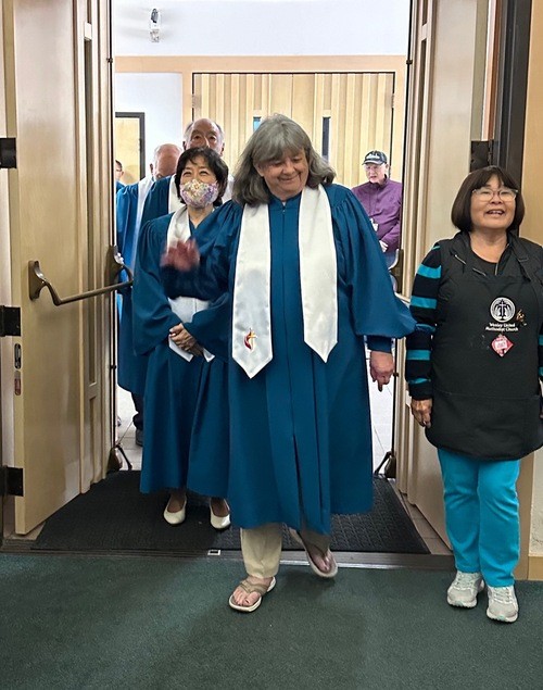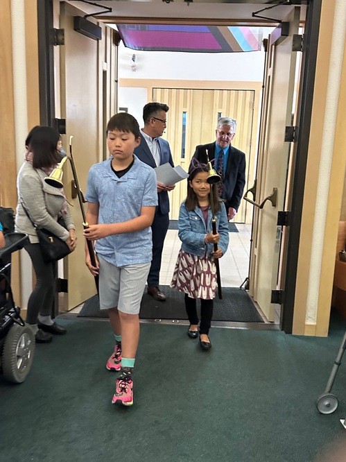 Acolytes Braden and Akemi lead Rev. John Oda and Mark Teagle as they formally walk in to begin service.