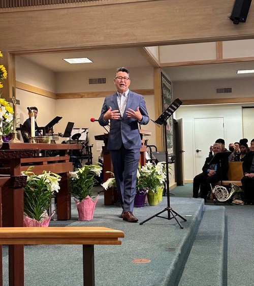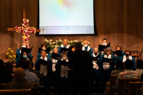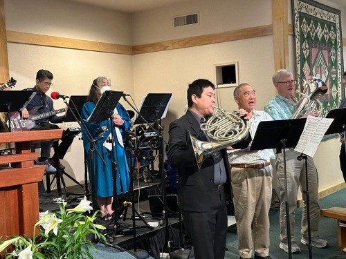 Wesley Praise Band, Ichiro Bakoshi and Joanne Miyahara and the Brass band, Kenton Kuwada , Ted Hasegawa, and Dave Brown played the Congregational hymn, “Christ the Lord is Risen Today.”