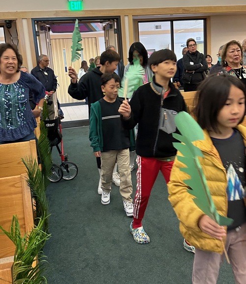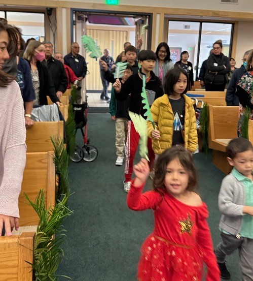 Our God’s Garden Sunday School children processed into church happily waving their palms welcoming Jesus to Jerusalem with loud Hosannas.