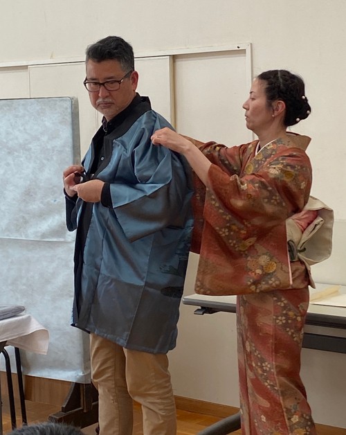 The beautiful gift to Rev. John with Tomoe ensuring the proper fit.