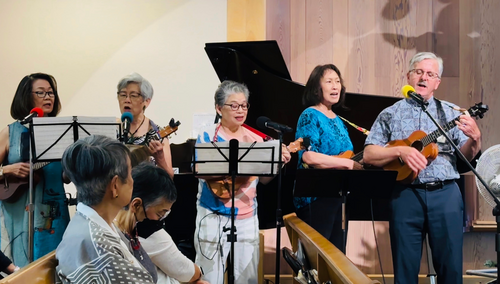 Singing a song written by our very own Mark Teagle, “Aloha Shalom” on ukuleles, were (from left): Jane Wong, Becky Soffiotto, Barbara Hiura, Tina Urata and Mark Teagle on June 16.