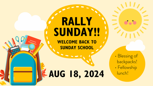 Join us on August 18th for Rally Sunday! Join us in celebrating our children, youth and teachers as we kick off the first day of Sunday School. We will do a blessing of the backpacks and present Bibles to our 3rd graders. Remember to bring your school backpacks!