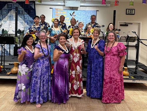 A number of Wesley Ukulele Band Members which included from left: Jake Shimada, Smiley Kai, Tina Urata, Ted and Marilyn Hasegawa, Becky Soffioto, Barbara Hiura, Mark Teagle, and Jane Wong, along with hula dancing friends performed twice at the Forum, a senior independent living residential community on July 31, and again at their Health Care Center on Aug. 14.
