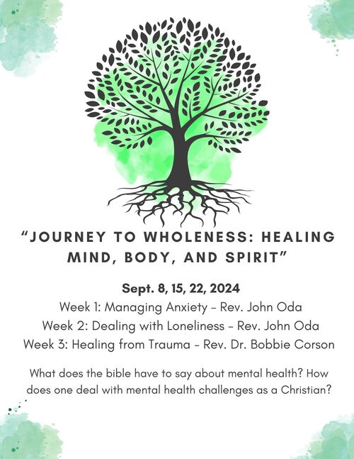 In September we are launching a new sermon series called: “Journey to Wholeness: Healing Mind, Body, and Spirit”. The sermon series will be on September 8th, 15th, & 22nd. It's important for all churches to talk about mental health because faith communities can offer a unique type of support through spiritual care, prayer, and connection. Mental health challenges affect people of all walks of life, and at all stages of life. By addressing mental health through this Fall sermon series, my hope is that Wesley will promote an environment of acceptance, reduce the stigma around talking about mental health and encourage honest conversations.