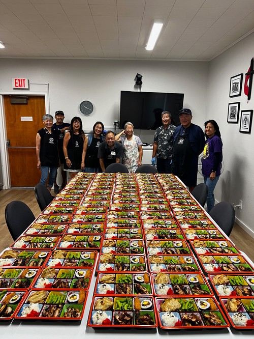 It was a nice mix of Wesley people with, from left: Ann Saito, Diana Marks and Judy Yasutake. And; look at the bento box filled with delectable treats...sushi, chicken teriyaki, edamame, fish and pork. A treat not shown was home-made manju from the hands of Marcia Yasukawa seen at the far left of the photo, hostessing.