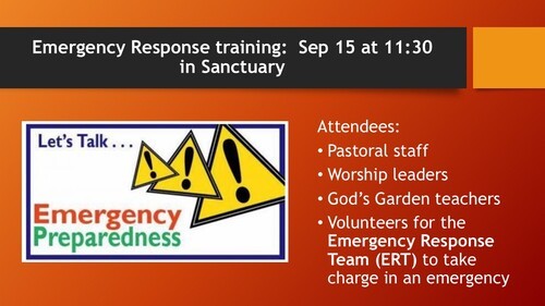 The ERT is a group of volunteers who have agreed to take charge of emergency situations, if needed, during Sunday Worship service. Annual training on emergency procedures is scheduled for Sep 15 in the Sanctuary at 11:30 am. If you are willing to volunteer, please plan to attend this training which will be led by Japantown Prepared! (emergency response team) leader and Wesley member Jeffrey Oldham. Jeffrey will provide training on what to do in case of an intruder, active shooter, fire, earthquake and other emergencies.
