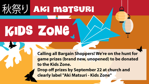 Drop off prizes by September 22 at church and clearly label "Aki Matsuri - Kids Zone" or reach out to Kellie Nunokawa or Kimi Taba DeRose through the church office to coordinate pick-up.