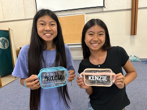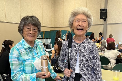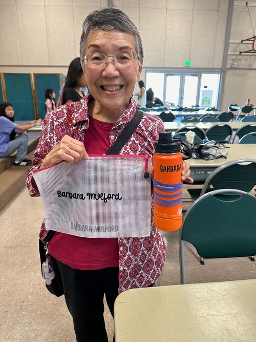 Look at what our seniors accomplished with Florence Oishi showing off her newly personalized water bottle and Rose Morita presenting her named cane. Very nifty indeed. Barbara Muford (right) won't lose her bottle or her newly named bag.