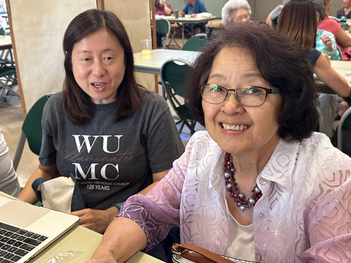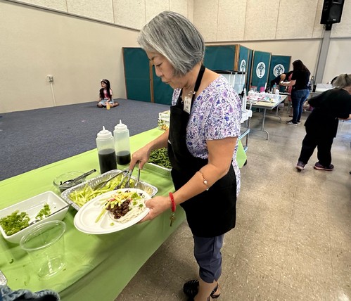 Lunch started off the fellowship time with Bev Acuna dishing up a delicious marinated pork saimin salad with eggs, kamaboko, zuccini, and green onions with edamame and apple pie bites for dessert.