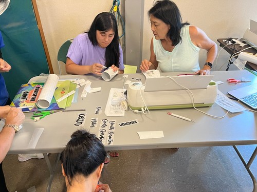 Mari and Kiyomi utilize the computer to create the designs and an electronic fabricator makes the name tags. The event was a fun-tilled afternoon and brought joy and smiles because everyone got to take home an item that was unique, special and very personal. Who doesn't like to see their name in print? All were blessed.
