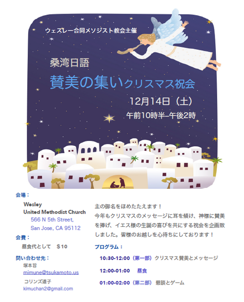 12月13日(金)はウェスレーのプライム・タイマーズ主催のクリスマスランチです。時間は11時半から2時まで、フェローシップ・ホールです。何方でも参加できるそうなので、お申し込みは塚本(mimune@tsukamoto.us)までご連絡ください。