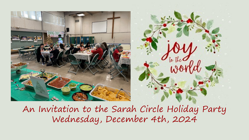 For those of you who may not know, the Sarah Circle is a small group of women who meet via Zoom once a month to discuss interesting books that help them to grow spiritually and that also helps them to gain an understanding of their lives and the world as it pertains to scripture. The holiday party is a lowkey way to meet the group and to get to know what Sarah Circle is all about. Anyone who is interested in attending is welcome. There will be a lunch catered by Buca de Beppo (Italian) that will include a set menu of pasta with artichoke/peas/sundried tomatoes in Alfredo sauce and eggplant parmesan (vegetarian). Salad and bread will also be provided, all served buffet style. The fee for the lunch is $20 per person. We will sit down and eat by 12 noon (but feel free to arrive a little early) and we should be finished with all our planned activities by 1:30 PM. An RSVP is needed by November 27th. Call or email the church office and your information can be forwarded to Terri Koike (holiday party chairperson). We hope to see you at the fun festivities!
