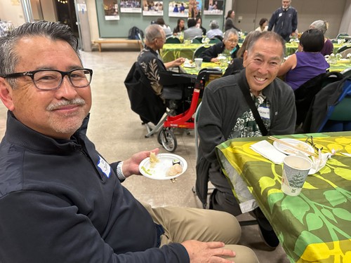 Not seen since before the Paris Olympics due to a hip dislocation and back issues but finally making an appearance at the Compassion Dinner was Wayne Haraguchi seen with Rev. John Oda.