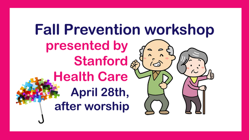 - “Farewell to Falls,” a fall prevention workshop presented by Stanford Health Center: An occupational therapist explained specific ways to reduce fall risks. Attendees received L.I.F.E. emergency contact & medical information forms with magnetic file pockets to attach to refrigerators.