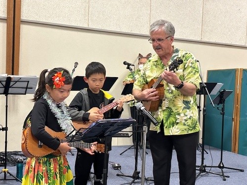 Two Wesley Keiki, students in the Ukulele class perform “Jingle Bells” are assisted by one of the teachers, Mark Teagle.