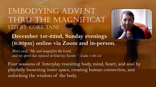 Guest facilitator Coke Tani, long-time friend to Wesley, has led "Embodying Advent thru the Magnificat". People in-person and online have used movement and poetry and journaling to consider the words of Mary from Luke 1:46-55: "Mary said, “My soul magnifies the Lord, and my spirit has rejoiced in God my Savior.” Coke, who lives in Torrance and attends Faith UMC, traveled to Wesley for the first session on December 1 and will return for the final session on December 22. And every session has been available on Zoom. "Doing movement while meditating on scripture was a little out of my comfort zone, one attendee remarked. "But Coke has really made Mary's words come alive for me. I'm glad I came." Contact Mark Teagle for information on this series or upcoming Spiritual Formation offerings.