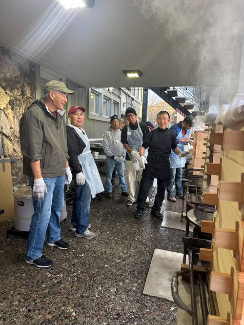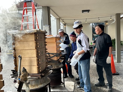 Akio Sekino and Randy Shingai oversee the mochi rice steaming.