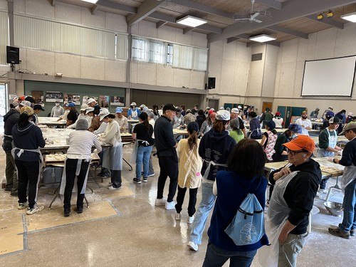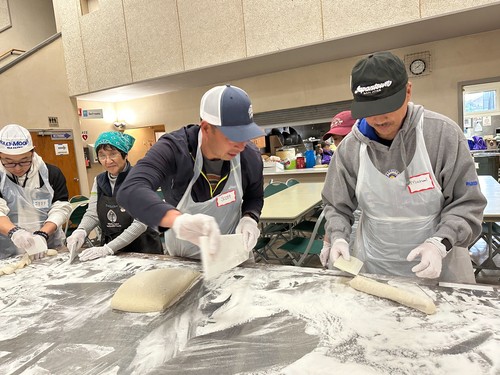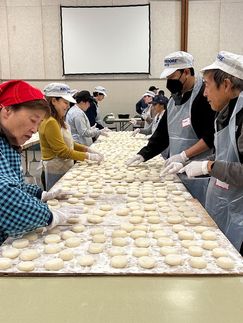 The village rises early to work the already steaming rice. Some surround tables to do cutting. A master-cutter appears at the head of the table to do the large cuts of the steaming hot mochi and pass to the cuttters. Some workers gather to turn the mochi as it cools. A small group at the back of the Fellowship Hall weighs and packages them for sale. A runner takes the 2 lbs packages to the sale room where another crew of workers makes them ready to divvy them out to the public. This goes on all morning and through the afternoon requiring two shifts of eager workers.