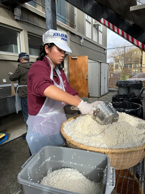 Oh gosh…it’s that time of year again, already! Just after Christmas, and as we’re recovering from that holiday, it’s Mochitsuki time and the approach of the New Year. Wesley Church is now in high gear, all abuzz with activity as a familiar crew works days in advance washing a ton of rice and soaking it in preparation for making mochi. But, oh, this activity is both important and necessary as we are indeed selling a fine Japanese traditional product much wanted this time of year. The day comes, and the village gathers to take the soaked, steamed, and pounded rice to make mochi. Round dumpling sized, and soft, it is put into New Year soup, ozoni, or into a pot of red beans called zen-zai or just toasted and eaten with sugar shoyu or kinako. This endeavor once a year requires our members plus Yu-Ai Kai, our partner in this endeavor. Everyone comes ready to work, along with a number of high school students. It is our mochitsuki that accommodates the Japantown neighborhood and beyond for this Japanese traditional food.