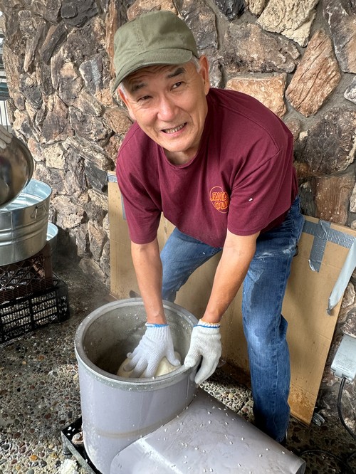 There are a number of folks in the kitchen preparing lunch for the all the workers. This year the workers were treated to chicken curry and hotdogs, rice and salad. Yes, indeed, it takes a village and Wesley solicits from Yu-Ai Kai who shares the product with its constituency. One ton of rice yields around 2,000 lbs.