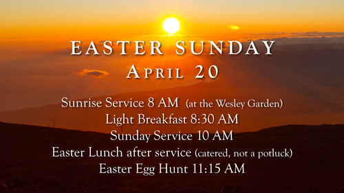 Wesley's God's Garden be collecting donations for the Easter Egg Hunt until April 6. They can drop off items in in the church office or in the Fellowship Hall on Sundays! God's Garden Easter Egg Hunt Sunday, April 20th. 11:15 am-12:30 in the backyard of the Issei Memorial Building. Please bring a basket for collecting eggs.......