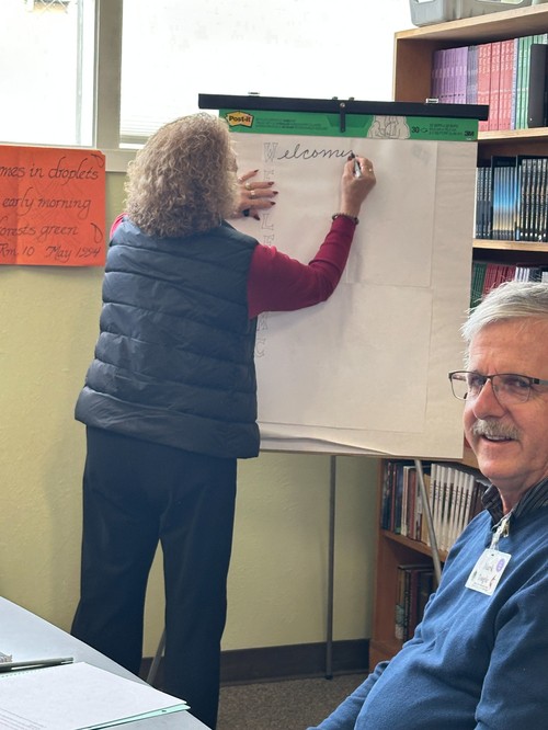 For our first exercise, she took the words Wesley UMC and with each letter, asked those present to make a word or words from our church name. And yes, we were thinking already of you Jesus, our Christian background, and our church specifically in deriving words from that name. Those attending, Mark Teagle, Rev. John Oda, Jim Mar, Rev. Dr. Roberta Corson, Misao Kusuda, and one outlier, me, reflected on our church and what emerged were impressions of Wesley. This style of poetic writing is called “Acrostic” and once done, a poem. “It doesn’t have to rhyme,” Jan remarked.