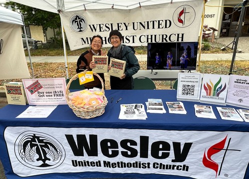 Bobbie Ueunten (left) and Terri Koike took the first shift in giving out information about our church and selling UWF Cookbooks at the bargain price of $15 and you get one free.