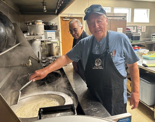 Cooks, Dale Sasaki and Hector Acuna (looking on) prepared the noodles of the somen salad.