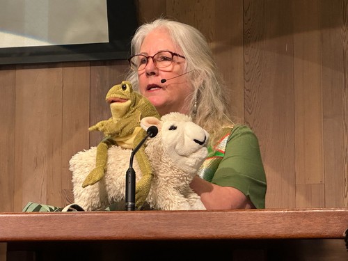 Rev. Claudia is shown here with her puppets she finds useful in her ministry, especially the lamb "Megumi," who helps with her children's messages. She also throws her voice very well. Her other puppet she shared with us was, Keiro, and the word FROG has significant meaning "fully reliant on God." That is what all missionaries and you as Christians do, she noted.