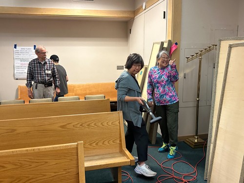 Warren Shimonishi helped clean the outside windows and coverings while Joanne Miyahara spot cleaned the Sanctuary carpet below.