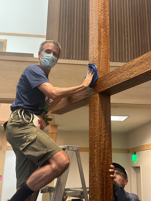 Brad Gee does some high ladder work cleaning the cross with Tomoko Tanaka keeping it steady and below, Jeffrey Oldham, finishes the top.