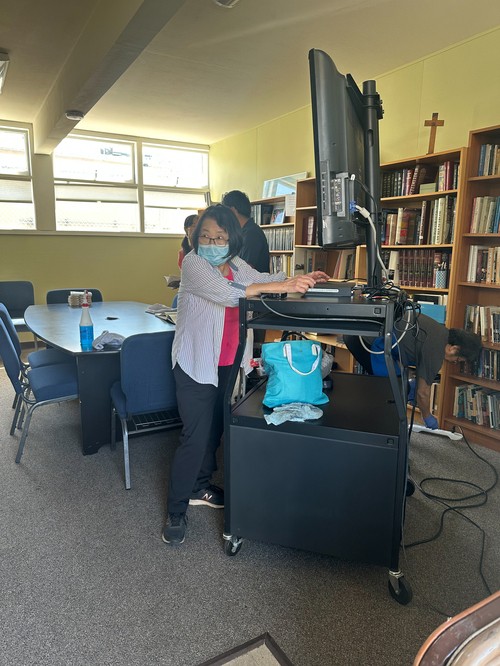 Mimune Tsukamoto plies his vacuuming skill in the chapel with Kazuko Hughes straightening up the books.