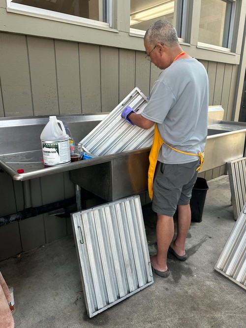 Tackling the yucky kitchen took elbow grease and hardwork with Tom Maeda (above) taking care of the wok area and Warren Uesato (below) cleaning the area around it sometimes with a toothbrush.