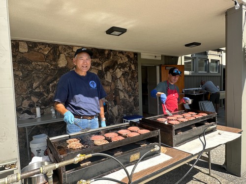 Mark Iwagaki (left) and Jim Mar cooked hamburgers and cheeseburgers to everyone's delight.