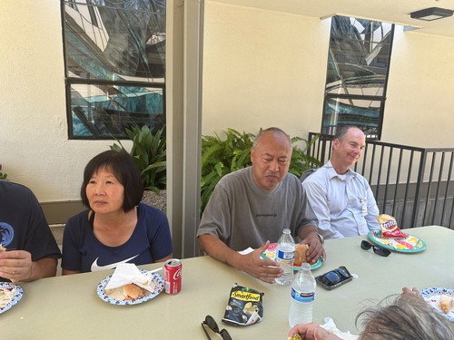 Wow! Our house sparkled. And God smiled and blessed us all including the yummy meal we were fed for our effort. Mark Iwagakii and Zena Fong and their cooking crew had hamburgers and cheeseburgers, all the fixings and condiments, chips, cookies, jello salad, and drinks. We were sated after and went home for a nap, but we were smiling too, of course.