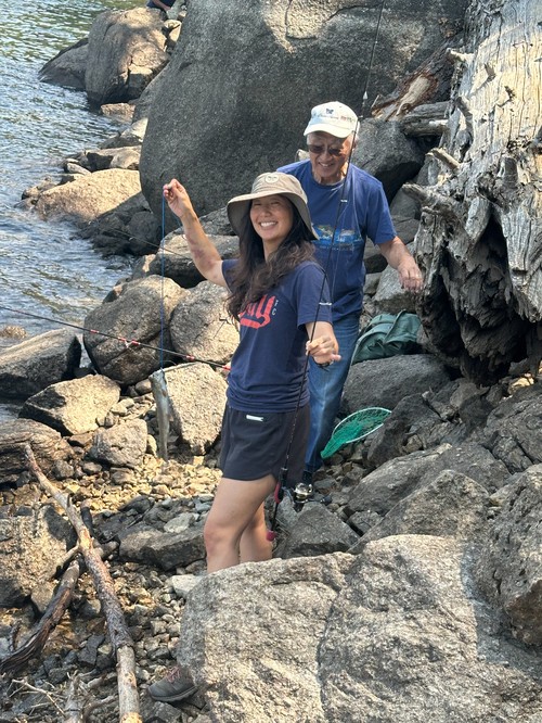 Lori Low and her pops, Warren Shimonishi catch fish.