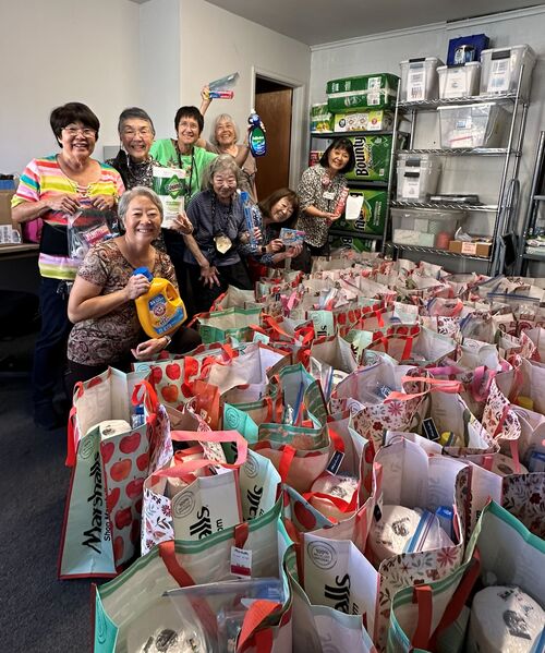 Workers who helped assemble the Blessing Bags were from left: Bev Acuna, Cynthia Fukuda, Barbara Mulford, Terri Koike, Joanne Kumano, Mary Chafey, Shizuko Adachi, Mary Horio and photographer/helper, Barbara Hiura.